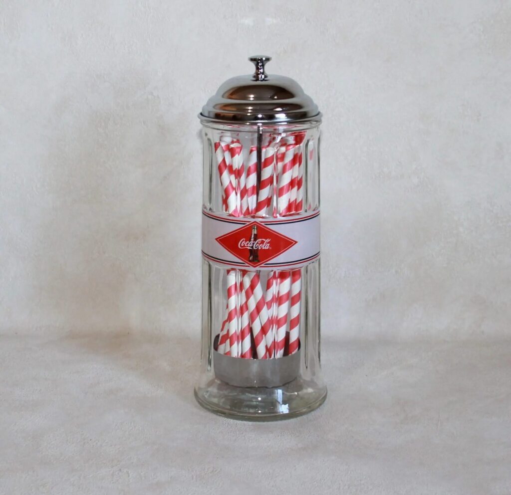 The Coca-Cola straw dispenser holds a special place in 1950s nostalgia. It reminds us of a time when gathering for a soda was a fun social event. For those who love both history and style, it’s a cool reminder of the past that still looks great today.