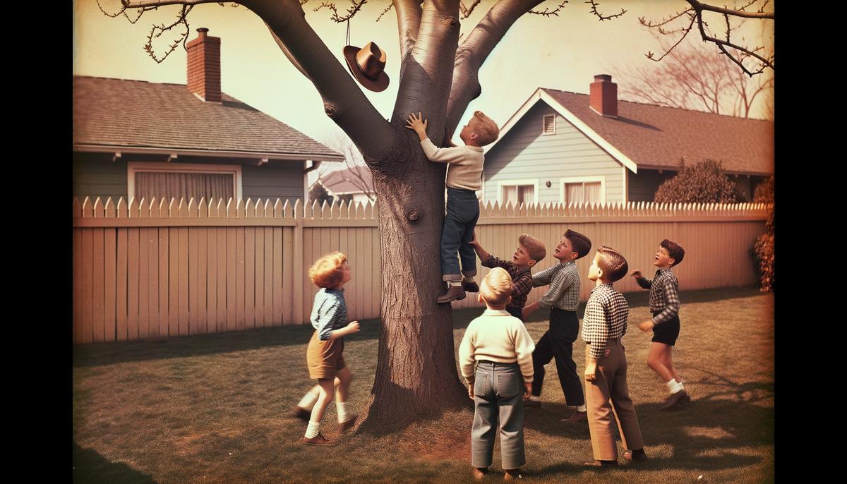 Looking back, it's not the big adventures that stand out most, but the simple things. The way the wind messed up our hair, the mischief in a friend's eyes, and how we worked together to get Johnny's hat down from the tree. These small things made up our childhood.