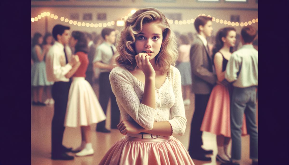 As the gym doors open, the energy of the 1950s school dance sweeps over everyone. The old gym is transformed into a magical scene of lights and music. Paper lanterns float overhead, casting soft glows. A shiny disco ball spins in the center, throwing tiny stars across walls and faces.