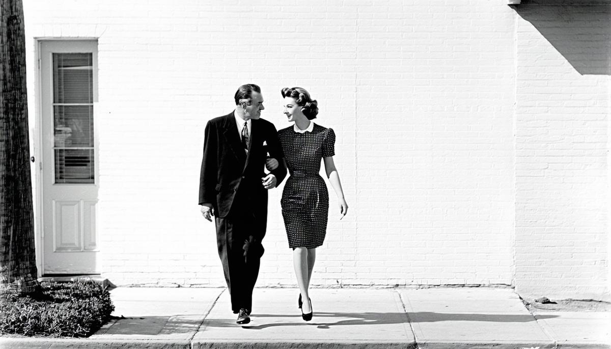 In the 1950s, a gentleman walking on the road side of the sidewalk was a common gesture of chivalry. This simple act showed care and protection, positioning the man between his companion and the traffic.