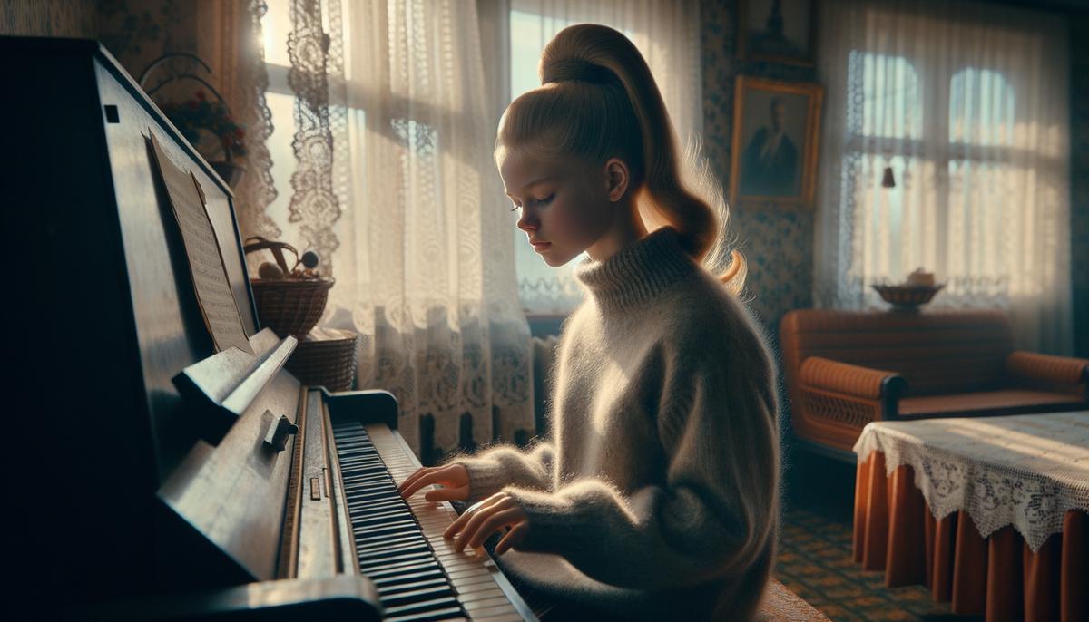 Now, picture me: a teenage girl at the piano. My ponytail is high, and I'm wearing a soft sweater. As I press the keys, each note floats across the room like a bubble, full of joy.