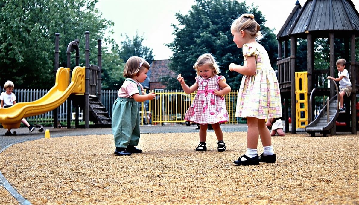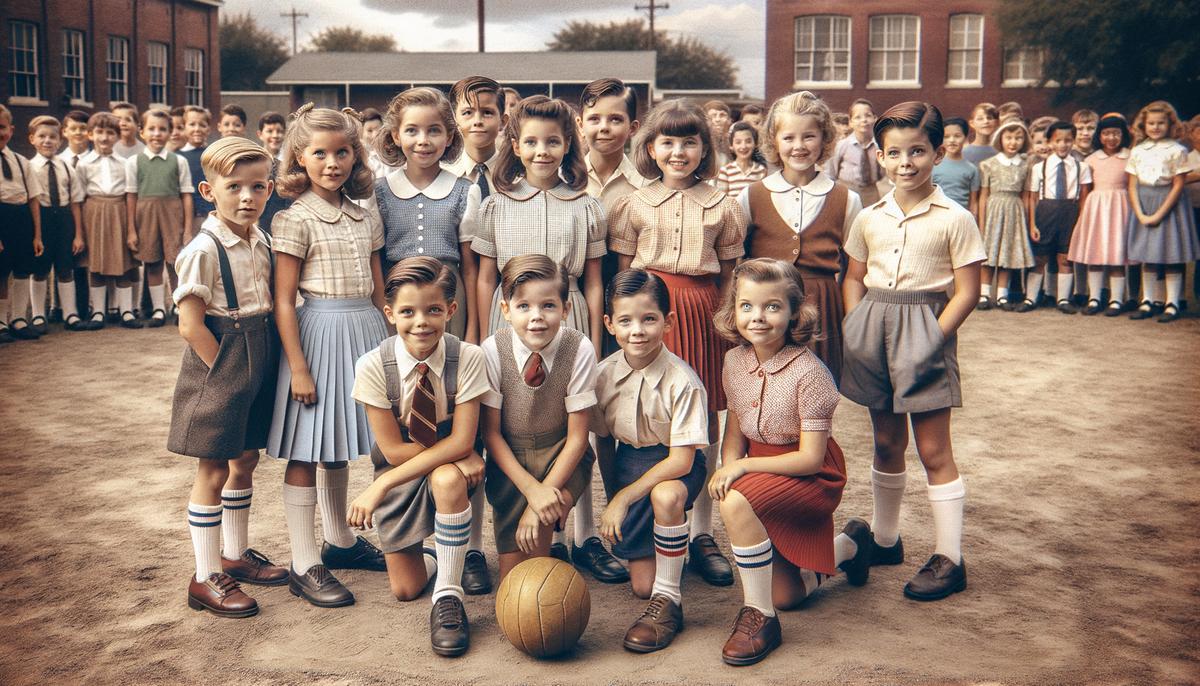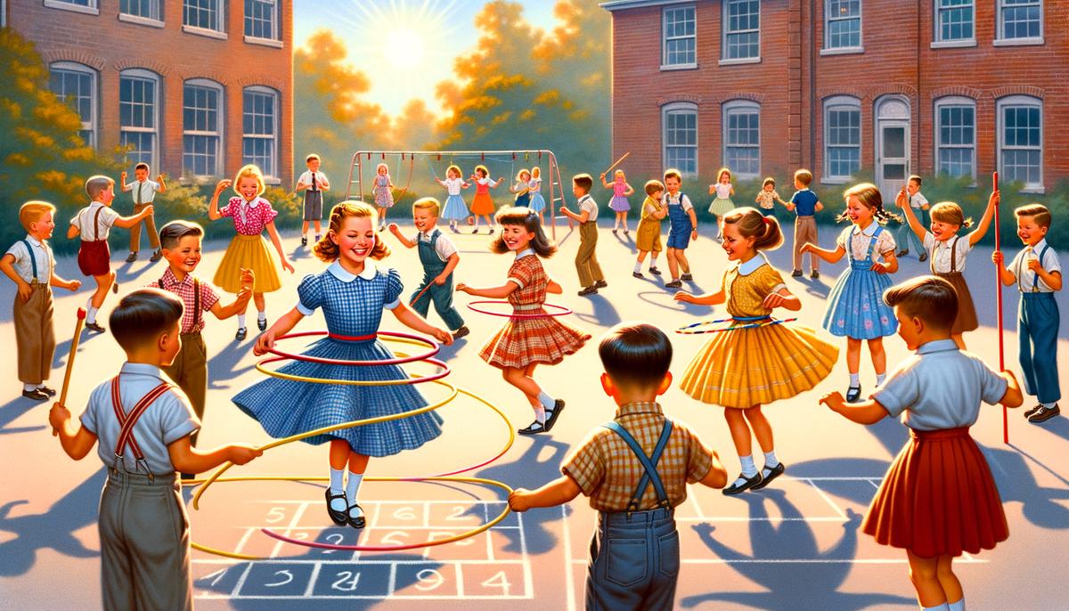 Picture a sunny schoolyard in the 1950s. It's so bright, it feels like a warm hug. Kids are everywhere, dressed in their best clothes. Girls twirl their skirts and spin hula hoops, giggling happily. Boys play hopscotch, jumping and shouting with joy.