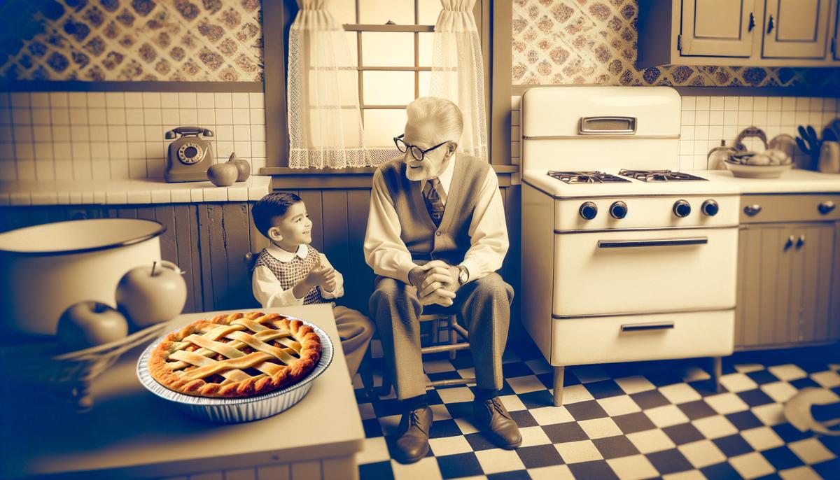 The kitchen was like stepping into a dream. With its checkered floors, humming old fridge, and the sweet smell of apple pie, it made you feel warm all over. I sat in one of those bright vinyl chairs that squeak when you move. Grandpa was there, his thick glasses catching the sun like a wise owl ready to share tales.