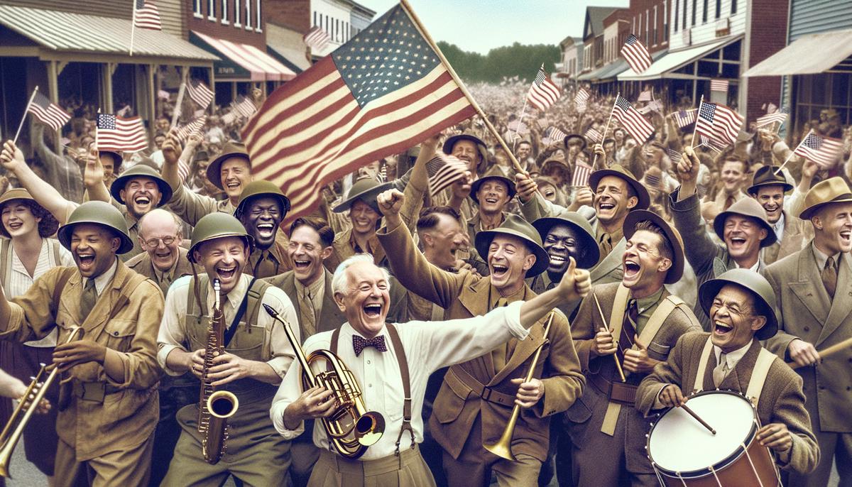 Grandpa said, hands moving. It was like the whole town came alive in colors you'd never imagined—flags, balloons, and all of us guys just laughing, hugging, cheering like wild.