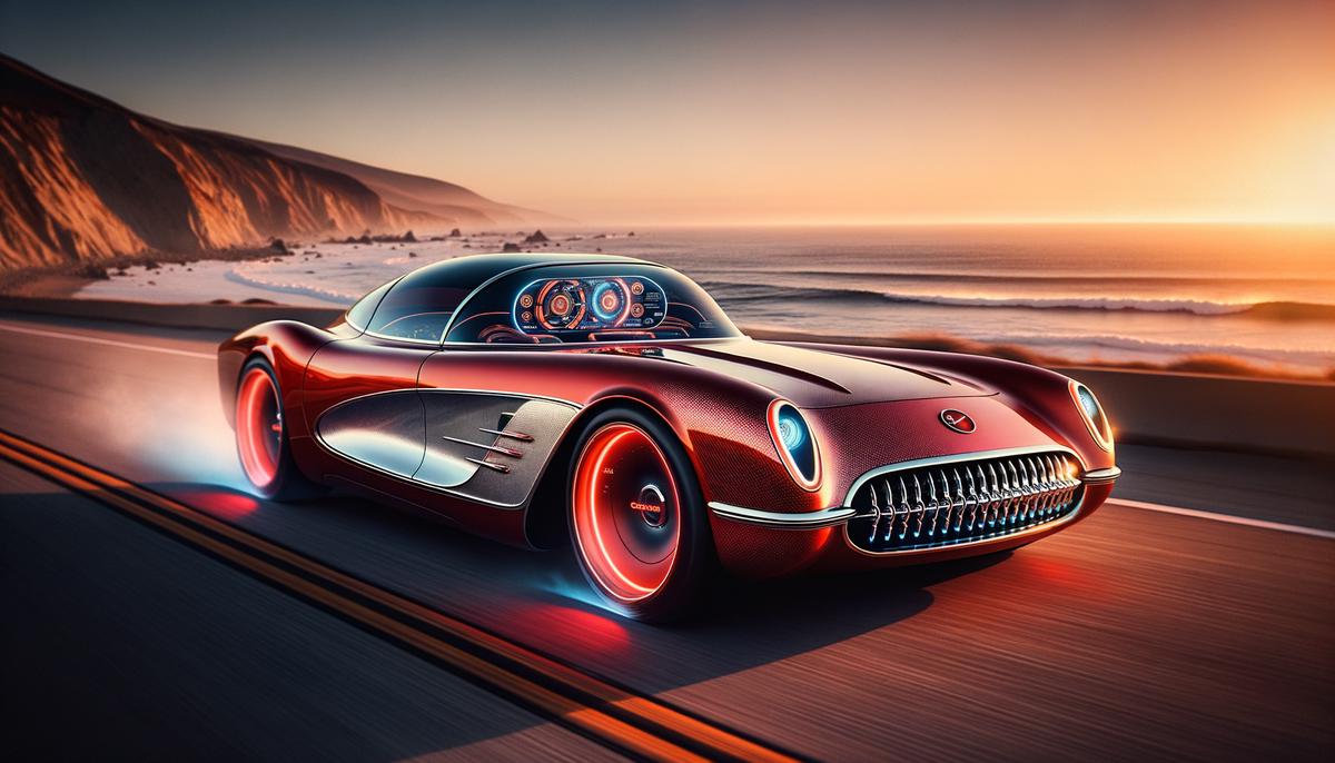 Imagine the classic 1953 Chevrolet Corvette, reimagined with an electric drivetrain that delivers instant torque. The exterior features a lightweight carbon-fiber body painted in a glossy red-and-white finish, with hidden door handles for a sleek look.