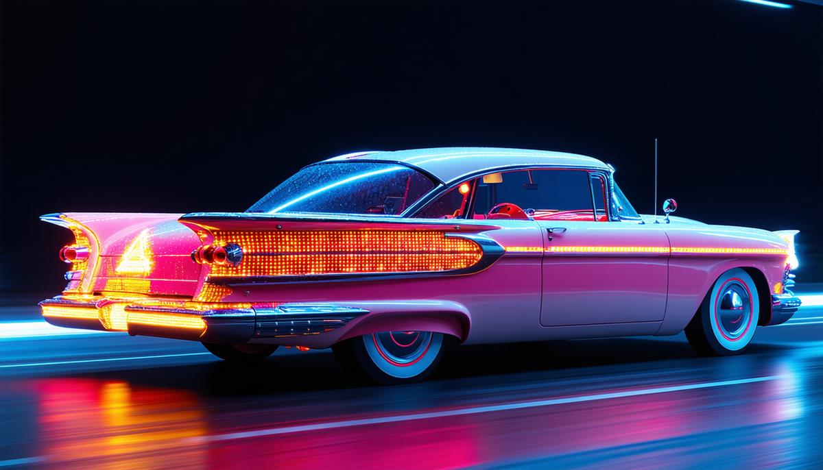 The 1959 Cadillac Eldorado has glided into the future. Those iconic tail fins have evolved into sleek, aerodynamic solar panels, gathering energy even while parked.